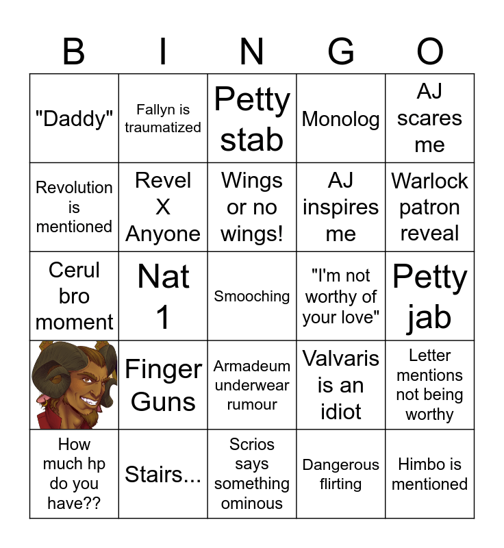 This bingo card has 1 images, a free space and 23 words: Finger Guns, Stairs..., Wings or no wings!, How much hp do you have??, AJ scares me, "Daddy", Revolution is mentioned, Fallyn is traumatized, "I'm not worthy of your love", Armadeum underwear rumour, AJ inspires me, Cerul bro moment, Valvaris is an idiot, Letter mentions not being worthy, Revel X Anyone, Dangerous flirting, Petty jab, Petty stab, Warlock patron reveal, Nat 1, Himbo is mentioned, Monolog and Scrios says something ominous.
