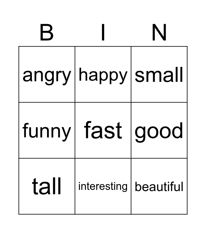 This bingo card has 9 words: tall, small, happy, funny, angry, good, fast, beautiful and interesting.