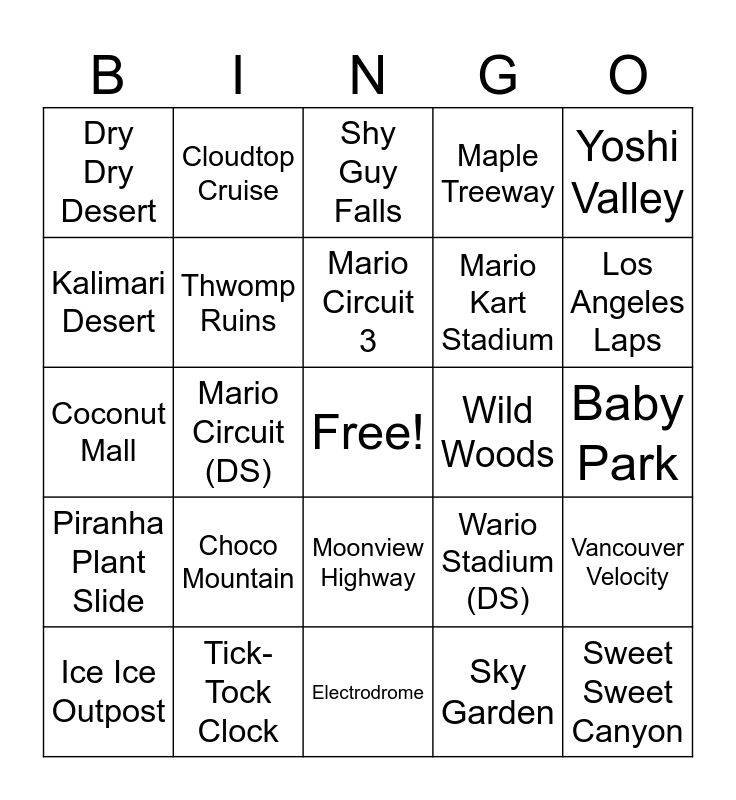 This bingo card has a free space and 98 words: Amsterdam Drift, Animal Crossing, Athens Dash, Baby Park, Bangkok Rush, Berlin Byways, Big Blue, Bone-Dry Dunes, Boo Lake, Bowser Castle 3 (SNES), Bowser's Castle (Wii U), Cheep Cheep Beach, Cheese Land, Choco Mountain, City Tracks, Cloudtop Cruise, Coconut Mall, Daisy Circuit, Daisy Cruiser, DK Jungle, DK Mountain, DK Summit, Dolphin Shoals, Donut Plains 3, Dragon Driftway, Dry Dry Desert, Electrodrome, Excitebike Arena, Grumble Volcano, Hyrule Circuit, Ice Ice Outpost, Kalimari Desert, Koopa Cape, London Loop, Los Angeles Laps, Madrid Drive, Maple Treeway, Mario Circuit, Mario Circuit (DS), Mario Circuit (GBA), Mario Circuit (Wii U), Mario Circuit 3, Mario Kart Stadium, Merry Mountain, Moo Moo Meadows, Moonview Highway, Mount Wario, Mushroom Gorge, Music Park, Mute City, Neo Bowser City, New York Minute, Ninja Hideaway, Paris Promenade, Peach Gardens, Piranha Plant Cove, Piranha Plant Slide, Rainbow Road (3DS), Rainbow Road (N64), Rainbow Road (SNES), Rainbow Road (Wii U), Rainbow Road (Wii), Ribbon Road, Riverside Park, Rock Rock Mountain, Rome Avanti, Rosalina's Ice World, Royal Raceway, Sherbet Land (GCN), Shroom Ridge, Shy Guy Falls, Singapore Speedway, Sky Garden, Sky-High Sundae, Snow Land, Squeaky Clean Sprint, Sunset Wilds, Sunshine Airport, Super Bell Subway, Sweet Sweet Canyon, Sydney Sprint, Thwomp Ruins, Tick-Tock Clock, Toad Circuit, Toad Harbor, Toad's Turnpike, Tokyo Blur, Twisted Mansion, Vancouver Velocity, Waluigi Pinball, Waluigi Stadium (GCN), Wario Stadium (DS), Wario's Gold Mine, Water Park, Wild Woods, Yoshi Circuit, Yoshi Valley and Yoshi's Island.
