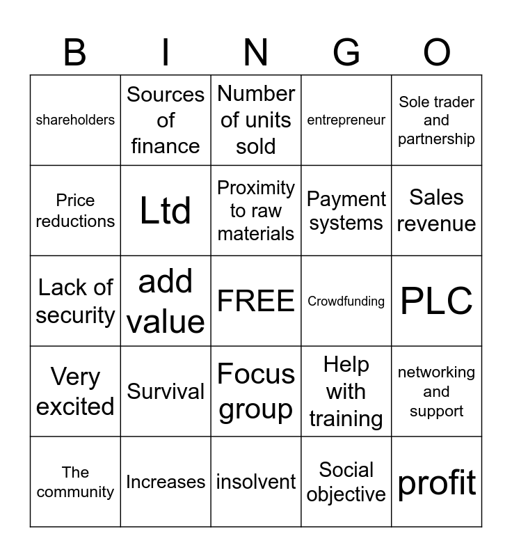 This bingo card has a free space and 24 words: Survival, Increases, Proximity to raw materials, The community, Sole trader and partnership, shareholders, Price reductions, Sources of finance, Crowdfunding, Focus group, Payment systems, Lack of security, Help with training, networking and support, Ltd, Social objective, PLC, Number of units sold, Sales revenue, add value, profit, Very excited, entrepreneur and insolvent.