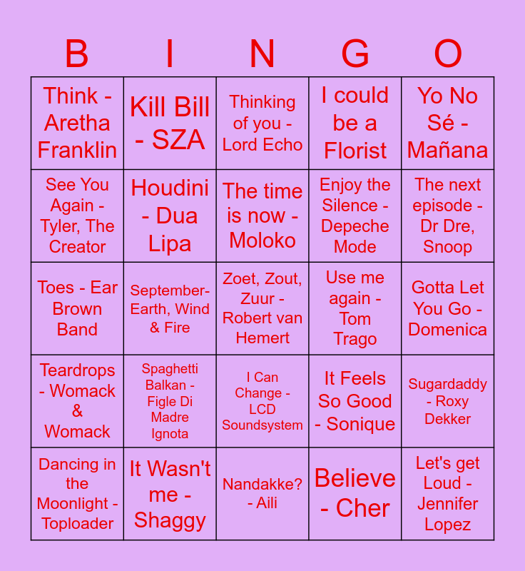 This bingo card has a free space and 24 words: Spaghetti Balkan - Figle Di Madre Ignota, It Wasn't me - Shaggy, The time is now - Moloko, Dancing in the Moonlight - Toploader, Yo No Sé - Mañana, Think - Aretha Franklin, See You Again - Tyler, The Creator, Kill Bill - SZA, Use me again - Tom Trago, I Can Change - LCD Soundsystem, Enjoy the Silence - Depeche Mode, Toes - Ear Brown Band, It Feels So Good - Sonique, Sugardaddy - Roxy Dekker, Houdini - Dua Lipa, Believe - Cher, Gotta Let You Go - Domenica, Thinking of you - Lord Echo, The next episode - Dr Dre, Snoop, September- Earth, Wind & Fire, Let's get Loud - Jennifer Lopez, Teardrops - Womack & Womack, I could be a Florist and Nandakke? - Aili.