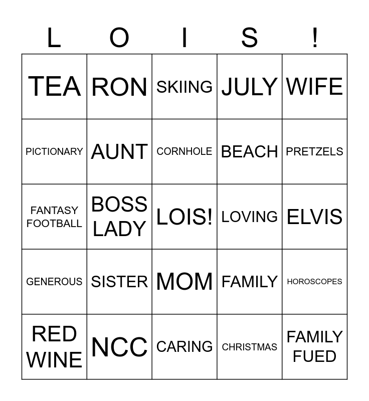 This bingo card has a free space and 24 words: SISTER, NCC, CORNHOLE, RED WINE, WIFE, TEA, PICTIONARY, RON, LOVING, MOM, BEACH, FANTASY FOOTBALL, FAMILY, HOROSCOPES, AUNT, CHRISTMAS, ELVIS, SKIING, PRETZELS, BOSS LADY, FAMILY FUED, GENEROUS, JULY and CARING.