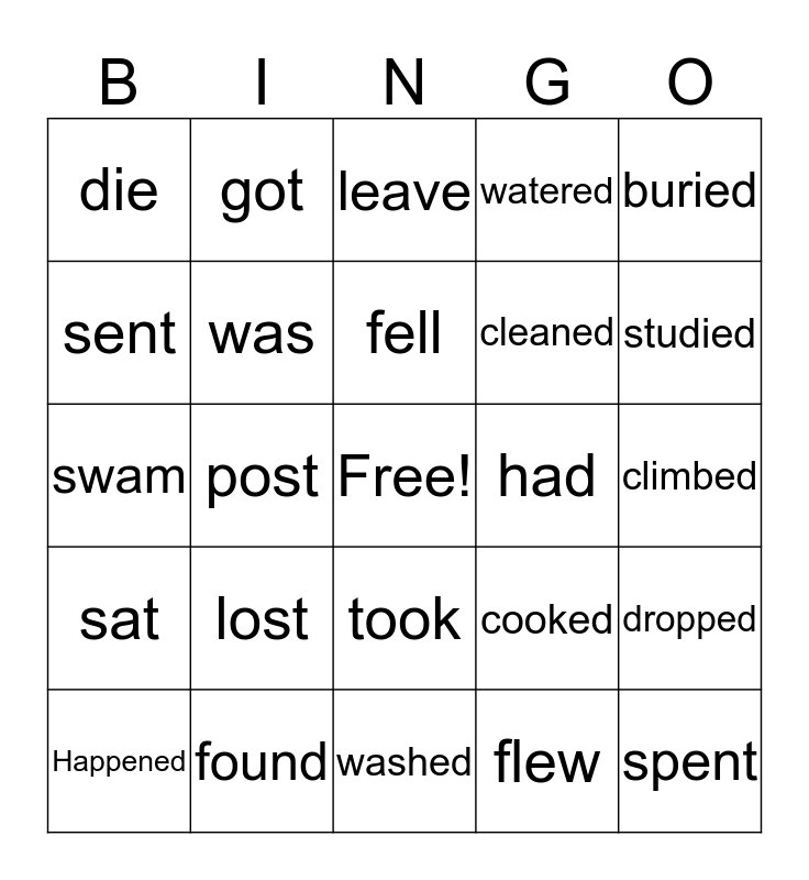 This bingo card has a free space and 29 words: Happened, went, post, buy, die, leave, was, lost, had, found, climbed, spent, washed, flew, studied, ate, took, sat, buried, swam, cooked, made, cleaned, sent, watered, got, dropped, fell and drank.