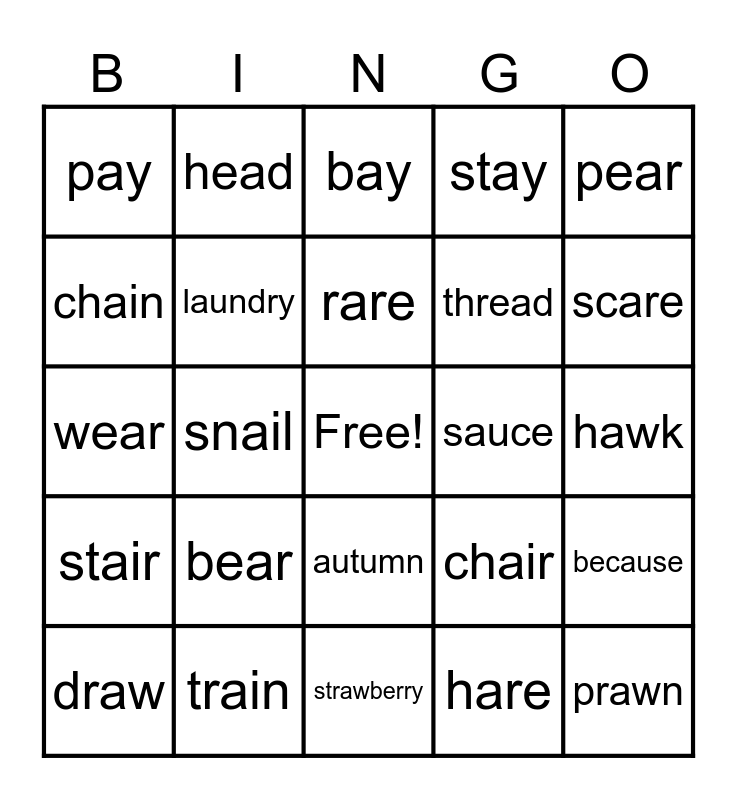This bingo card has a free space and 30 words: train, rain, snail, tray, pay, bay, laundry, autumn, sauce, strawberry, hawk, prawn, hare, share, scare, hair, chair, stair, bear, pear, wear, bread, head, thread, chain, stay, because, draw, rare and pair.