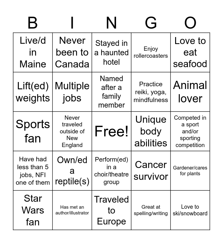 This bingo card has a free space and 46 words: Night owl, Love to ski/snowboard, Own/ed a dog(s), Traveled to Europe, Own/ed a reptile(s), Left Handed, Never been to Canada, Live/d on a farm, Lift(ed) weights, Have been to Disney, Multiple jobs, Enjoy rollercoasters, Gardener/cares for plants, Cancer survivor, Been to Vegas, Enjoy quilting, Named after a family member, Unique body abilities, Afraid of certain/some animals, Love to eat seafood, Never traveled outside of New England, Great at spelling/writing, Live/d in Maine, Practice reiki, yoga, mindfulness, Had a paranormal experience, Animal lover, Star Wars fan, Enjoy board/card games, Perform(ed) in a choir/theatre group, Have had less than 5 jobs, NFI one of them, Traveled to Asia, Want to own their own bakery, Likes to cook, Plant killer, Make-up artist, Has met an author/illustrator, Competed in a sport and/or sporting competition, Enjoy true crime, Book lover, Former teacher, Middle child, Stayed in a haunted hotel, Sports fan, Have worked in a prison, Have held/touched a unique/exotic animal and Lived in the same city for a long time.