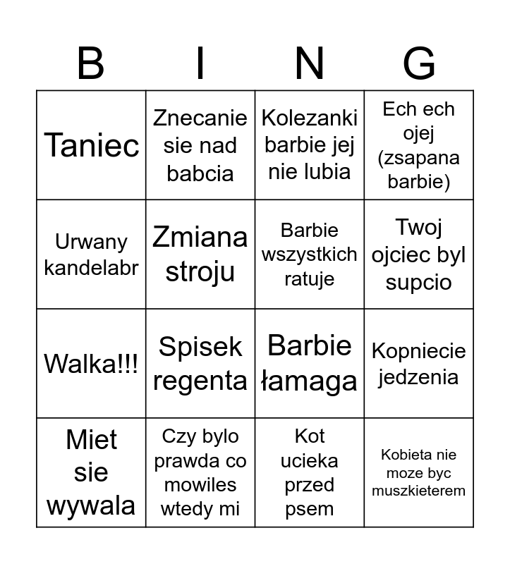 This bingo card has 28 words: Wymadrzanie, Znecanie sie nad babcia, Walka!!!, Panski pies je moj list π‘π‘, Zmiana stroju, Kolezanki barbie jej nie lubia, Znecanie sie nad babcia, Kobieta nie moze byc muszkieterem, Czy bylo prawda co mowiles wtedy mi, Ludzie regenta π, Barbie Εamaga, Ech ech ojej (zsapana barbie), Niszczenie mienia, Trening, Spisek regenta, Wynalazek ksiΔcia nie dziala, Ksiaze prawie umiera, Barbie wszystkich ratuje, Twoj ojciec byl supcio, Oskarzenie regenta, Taniec, Wymyslanie imion (na balu), Miet sie wywala, Kopniecie jedzenia, Kot ucieka przed psem, Tajne przejscie, Urwany kandelabr and Skradanie sie.