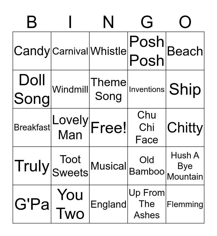 This bingo card has a free space and 24 words: Toot Sweets, You Two, Theme Song, G'Pa, Beach, Candy, Doll Song, Carnival, Chu Chi Face, Musical, Inventions, Breakfast, Old Bamboo, Hush A Bye Mountain, Windmill, Up From The Ashes, Chitty, Whistle, Ship, Lovely Man, Flemming, Truly, Posh Posh and England.