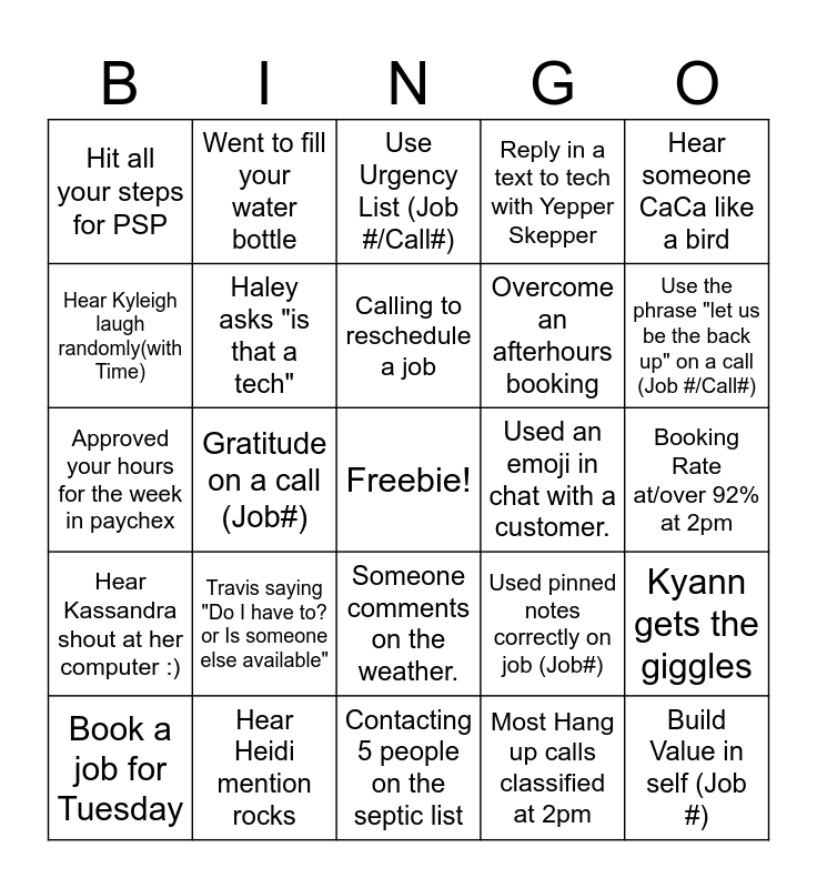This bingo card has a free space and 25 words: Travis saying "Do I have to? or Is someone else available", Contacting 5 people on the septic list, Calling to reschedule a job, Book a job for Tuesday, Hear someone CaCa like a bird, Hit all your steps for PSP, Hear Kyleigh laugh randomly(with Time), Went to fill your water bottle, Used an emoji in chat with a customer., Someone comments on the weather., Overcome an afterhours booking, Approved your hours for the week in paychex, Used pinned notes correctly on job (Job#), Kyann gets the giggles, Haley asks "is that a tech", Inbox Empited, Booking Rate at/over 92% at 2pm, Use Urgency List (Job #/Call#), Use the phrase "let us be the back up" on a call (Job #/Call#), Gratitude on a call (Job#), Build Value in self (Job #), Hear Heidi mention rocks, Hear Kassandra shout at her computer :), Reply in a text to tech with Yepper Skepper and Most Hang up calls classified at 2pm.