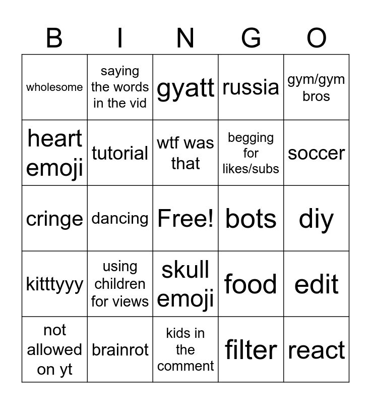 This bingo card has a free space and 24 words: using children for views, brainrot, wtf was that, not allowed on yt, gym/gym bros, wholesome, heart emoji, saying the words in the vid, bots, skull emoji, begging for likes/subs, cringe, food, edit, tutorial, filter, diy, gyatt, soccer, dancing, react, kitttyyy, russia and kids in the comment.
