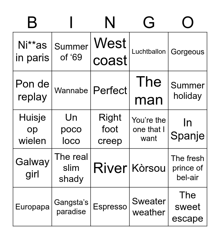 This bingo card has a free space and 24 words: Europapa, The real slim shady, Perfect, Sweater weather, Gorgeous, Ni**as in paris, Summer of ‘69, West coast, You’re the one that I want, In Spanje, Huisje op wielen, Wannabe, Kòrsou, The fresh prince of bel-air, Pon de replay, Gangsta’s paradise, Espresso, Luchtballon, Summer holiday, Galway girl, Un poco loco, River, The man and The sweet escape.