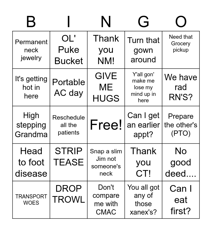 This bingo card has a free space and 24 words: STRIP TEASE, DROP TROWL, GIVE ME HUGS, TRANSPORT WOES, Need that Grocery pickup, Permanent neck jewelry, It's getting hot in here, OL' Puke Bucket, Can I get an earlier appt?, Snap a slim Jim not someone's neck, Y'all gon' make me lose my mind up in here, High stepping Grandma, Thank you CT!, No good deed...., Portable AC day, You all got any of those xanex's?, Prepare the other's (PTO), Thank you NM!, We have rad RN'S?, Reschedule all the patients, Can I eat first?, Head to foot disease, Turn that gown around and Don't compare me with CMAC.