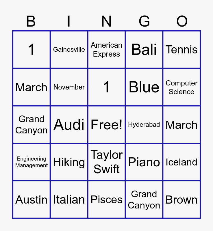 This bingo card has a free space and 84 words: Bangalore, Jacksonville, American Express, Deloitte, Gainesville, Univ of Florida, Univ of Cali Los Ang, Actor, Guitar, Piano, Bali, Orlando, November, Hyderabad, Italian, 1, Austin, March, July, 4, 7, Blue, Brown, Seagreen, Audi, Acura, Tennis, Badminton, Iceland, Travelling, Hiking, Ed Sheeran, Taylor Swift, Grand Canyon, Coffee, Cookies and Cream, Pisces, Leo, Computer Science, Engineering Management, Physics, Math, Bangalore, Jacksonville, American Express, Deloitte, Gainesville, Univ of Florida, Univ of Cali Los Ang, Actor, Guitar, Piano, Bali, Orlando, November, Hyderabad, Italian, 1, Austin, March, July, 4, 7, Blue, Brown, Seagreen, Audi, Acura, Tennis, Badminton, Iceland, Travelling, Hiking, Ed Sheeran, Taylor Swift, Grand Canyon, Coffee, Cookies and Cream, Pisces, Leo, Computer Science, Engineering Management, Physics and Math.
