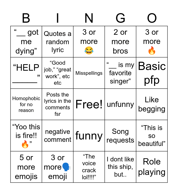 This bingo card has a free space and 44 words: “We making it out of __ with this one! 🔥”, Role playing, What music do you like? Me:, 5 or more emojis, Shipping wars, I dont like this ship, but.., 3 or more 😂, 3 or more💀, 3 or more🔥, 3 or more🗣️ emoji, 2 or more bros, unfunny, funny, negative comment, Sexualization of character, “The voice crack lol!!!!”, 2 or more comments that say the same thing, Homophobic for no reason, South Park pfp, Basic pfp, Quotes a random lyric, edit:, As a __, “__ got me dying”, Brainrot, Like begging, Style, Ships unrelated to video, Song requests, “Yoo this is fire!! 🔥”, “I like this more than the original”, “This is so beautiful”, “voice is majestic”, “IM LITERALLY CRYING”, Posts the lyrics in the comments fsr, “Matt and Trey need to see this!”, Probably like 5 years old, “The perfect cover doesnt exist-“, Misspellings, “HELP _____”, “__ is my favorite singer”, “Im gonna make an animation of this!”, “Good job,” “great work”, etc etc and Rairpare commenter!.