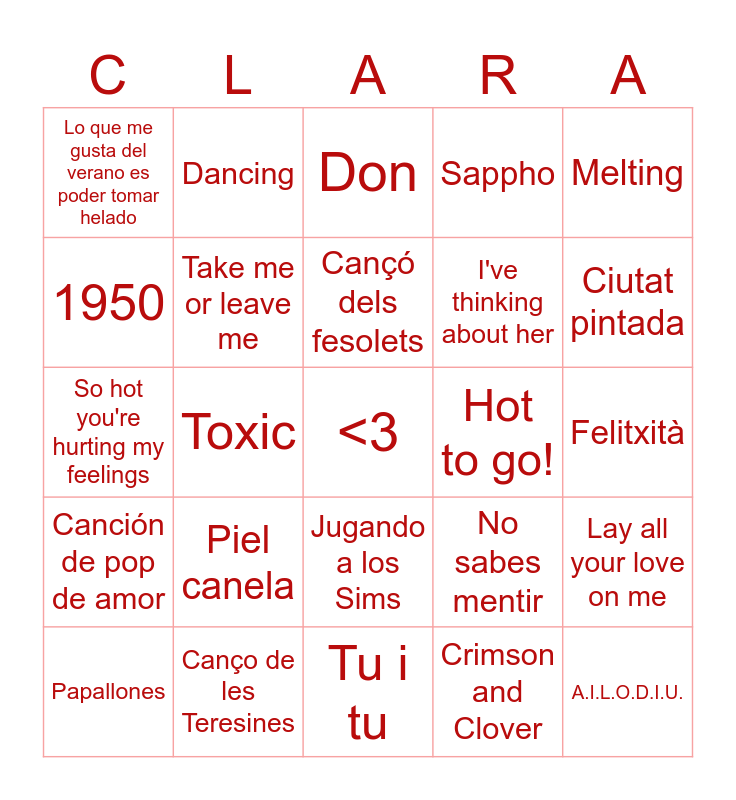 This bingo card has a free space and 29 words: Papallones, O meu cão, Toxic, Per què he plorat?, Lo que me gusta del verano es poder tomar helado, Don, Take me or leave me, Piel canela, Hot to go!, Canço de les Teresines, Felitxità, A.I.L.O.D.I.U., Tu i tu, Crimson and Clover, Ciutat pintada, The Lakes, Jugando a los Sims, Canción de pop de amor, Melting, So hot you're hurting my feelings, No sabes mentir, Good looking, I've thinking about her, 1950, Sappho, Dancing, Lay all your love on me, Cançó dels fesolets and Oops...I did it again.
