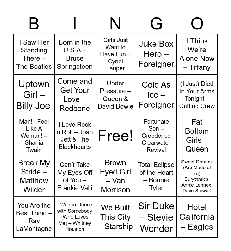 This bingo card has a free space and 39 words: Here Comes the Sun – The Beatles, Paradise City – Guns N’ Roses, O-o-h Child – The Five Stairsteps, Come and Get Your Love – Redbone, You Are the Best Thing – Ray LaMontagne, Brown Eyed Girl – Van Morrison, Under Pressure – Queen & David Bowie, Don’t Stop Me Now – Queen, I Think We’re Alone Now – Tiffany, Break My Stride – Matthew Wilder, I Love Rock n Roll – Joan Jett & The Blackhearts, Juke Box Hero – Foreigner, Hotel California – Eagles, Fat Bottom Girls – Queen, Fortunate Son – Creedence Clearwater Revival, Can’t Take My Eyes Off of You – Frankie Valli, Go On Your Own Way – Fleetwood Mac, I Saw Her Standing There – The Beatles, Proud Mary – Creedence Clearwater Revival, Total Eclipse of the Heart – Bonnie Tyler, Uptown Girl – Billy Joel, We Built This City – Starship, Cold As Ice – Foreigner, (I Just) Died In Your Arms Tonight – Cutting Crew, Red Red Wine – UB40, Rosanna – TOTO, Walk Like an Egyptian – The Bangles, Come On Eileen – Dexys Midnight Runners, Sussudio – Phil Collins, Born in the U.S.A – Bruce Springsteen, Fast Car – Tracy Chapman, You Spin Me Round (Like a Record) – Dead Or Alive, Girls Just Want to Have Fun – Cyndi Lauper, I Wanna Dance with Somebody (Who Loves Me) – Whitney Houston, Sir Duke – Stevie Wonder, Physical – Olivia Newton-John, Sweet Dreams (Are Made of This) – Eurythmics, Annie Lennox, Dave Stewart, Man! I Feel Like A Woman! – Shania Twain and Short Skirt / Long Jacket – CAKE.
