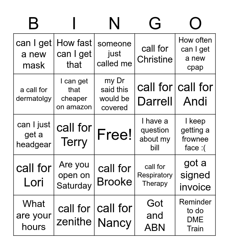 This bingo card has a free space and 24 words: What are your hours, Are you open on Saturday, my Dr said this would be covered, Got and ABN, How often can I get a new cpap, can I get a new mask, How fast can I get that, someone just called me, I have a question about my bill, I keep getting a frownee face :(, can I just get a headgear, I can get that cheaper on amazon, call for Respiratory Therapy, got a signed invoice, a call for dermatolgy, call for zenithe, call for Nancy, call for Christine, call for Andi, call for Lori, call for Terry, call for Brooke, call for Darrell and Reminder to do DME Train.