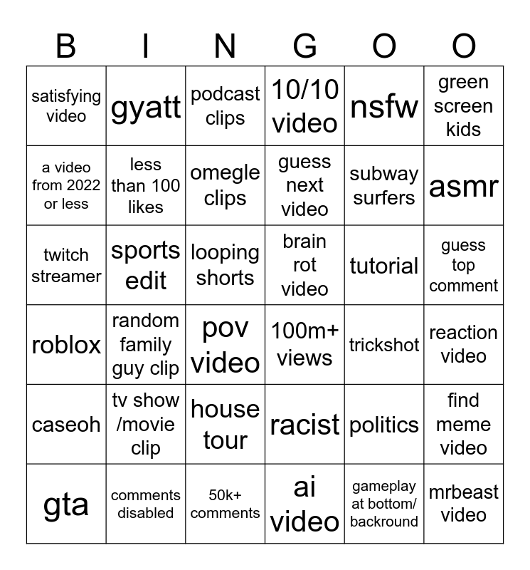 This bingo card has 36 words: racist, house tour, ai video, a video from 2022 or less, roblox, brain rot video, less than 100 likes, 50k+ comments, nsfw, politics, asmr, 10/10 video, find meme video, sports edit, guess next video, satisfying video, caseoh, tutorial, twitch streamer, podcast clips, looping shorts, random family guy clip, 100m+ views, pov video, trickshot, gyatt, subway surfers, comments disabled, omegle clips, green screen kids, mrbeast video, gta, reaction video, guess top comment, tv show /movie clip and gameplay at bottom/ backround.