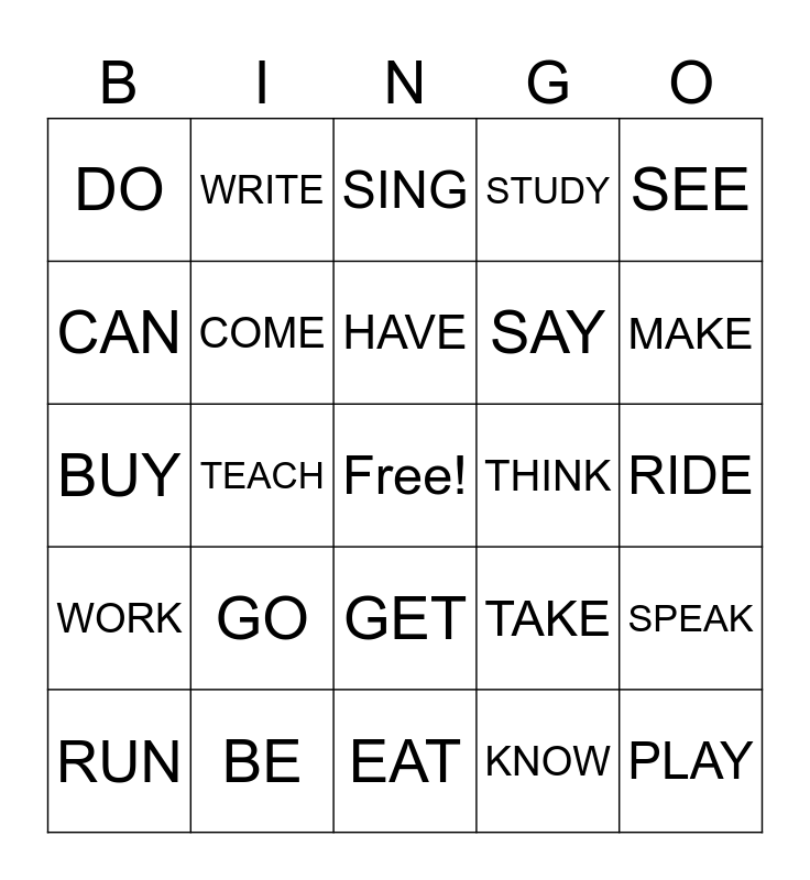 This bingo card has a free space and 24 words: GO, BE, HAVE, RUN, SEE, DO, CAN, WRITE, THINK, GET, SAY, BUY, TAKE, SPEAK, COME, KNOW, RIDE, SING, MAKE, TEACH, PLAY, WORK, STUDY and EAT.