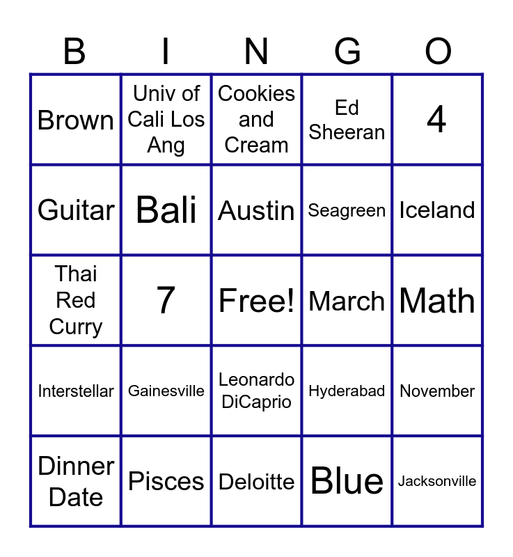 This bingo card has a free space and 52 words: Bangalore, Jacksonville, American Express, Deloitte, Gainesville, Univ of Florida, Univ of Cali Los Ang, Actor, Guitar, Piano, Bali, Orlando, November, Hyderabad, Italian, 1, Austin, March, July, 4, 7, Blue, Brown, Seagreen, Audi, Acura, Tennis, Badminton, Iceland, Travelling, Hiking, Ed Sheeran, Taylor Swift, Grand Canyon, Coffee, Cookies and Cream, Pisces, Leo, Computer Science, Engineering Management, Physics, Math, Interstellar, Yeh Jawaani Hai Deewani, Leonardo DiCaprio, Coldplay, Asian, Thai Red Curry, Tres Leches, Black Forest, Dinner Date and Dance.