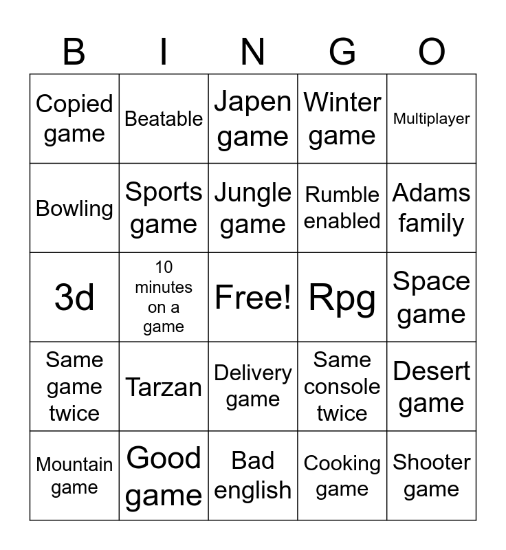This bingo card has a free space and 30 words: Good game, Bad game, 10 minutes on a game, Unplayable game, Copied game, Japen game, Sports game, Delivery game, Rpg, Bad english, Space game, Shooter game, Cooking game, Music game, Adams family, Bad cover art, Same console twice, Same game twice, Tarzan, Multiplayer, 3d, 2d, Beatable, Rumble enabled, Bowling, Winter game, Desert game, Mountain game, Jungle game and Crashes.