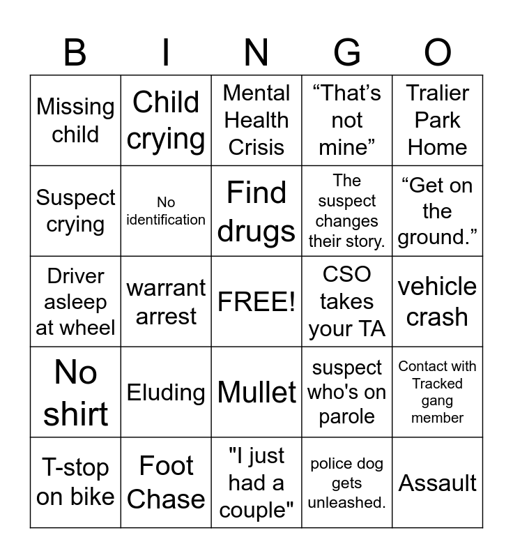 This bingo card has a free space and 24 words: Eluding, Foot Chase, Find drugs, T-stop on bike, Tralier Park Home, Missing child, Suspect crying, Child crying, CSO takes your TA, Mullet, The suspect changes their story., Driver asleep at wheel, suspect who's on parole, Contact with Tracked gang member, No identification, police dog gets unleashed., vehicle crash, Mental Health Crisis, “Get on the ground.”, warrant arrest, Assault, No shirt, “That’s not mine” and "I just had a couple".
