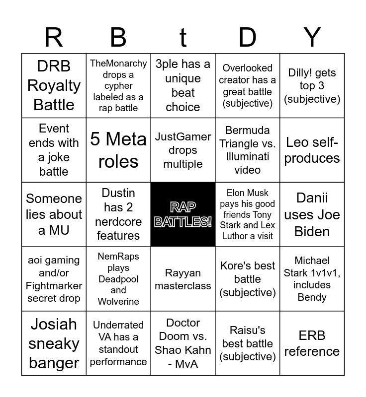 This bingo card has a free space and 24 words: NemRaps plays Deadpool and Wolverine, Underrated VA has a standout performance, JustGamer drops multiple, Josiah sneaky banger, Dilly! gets top 3 (subjective), DRB Royalty Battle, Event ends with a joke battle, TheMonarchy drops a cypher labeled as a rap battle, Elon Musk pays his good friends Tony Stark and Lex Luthor a visit, Rayyan masterclass, Bermuda Triangle vs. Illuminati video, Someone lies about a MU, Kore's best battle (subjective), Michael Stark 1v1v1, includes Bendy, 5 Meta roles, Raisu's best battle (subjective), Danii uses Joe Biden, 3ple has a unique beat choice, Leo self-produces, Dustin has 2 nerdcore features, ERB reference, aoi gaming and/or Fightmarker secret drop, Overlooked creator has a great battle (subjective) and Doctor Doom vs. Shao Kahn - MvA.