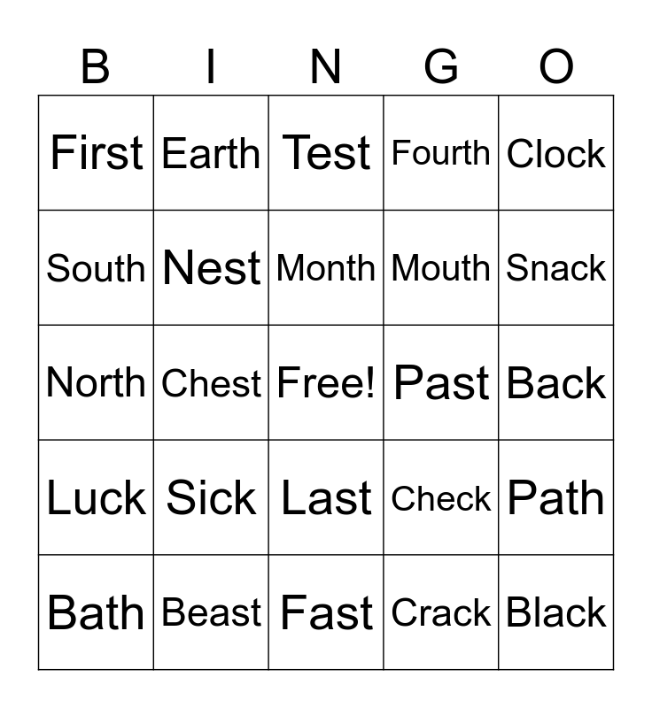 This bingo card has a free space and 30 words: Beast, Ghost, Chest, Wrist, First, Test, Nest, Last, Past, Fast, Back, Black, Crack, Pack, Snack, Neck, Check, Luck, Sick, Clock, North, Math, Earth, Mouth, South, Fourth, Path, Bath, Month and Teeth.