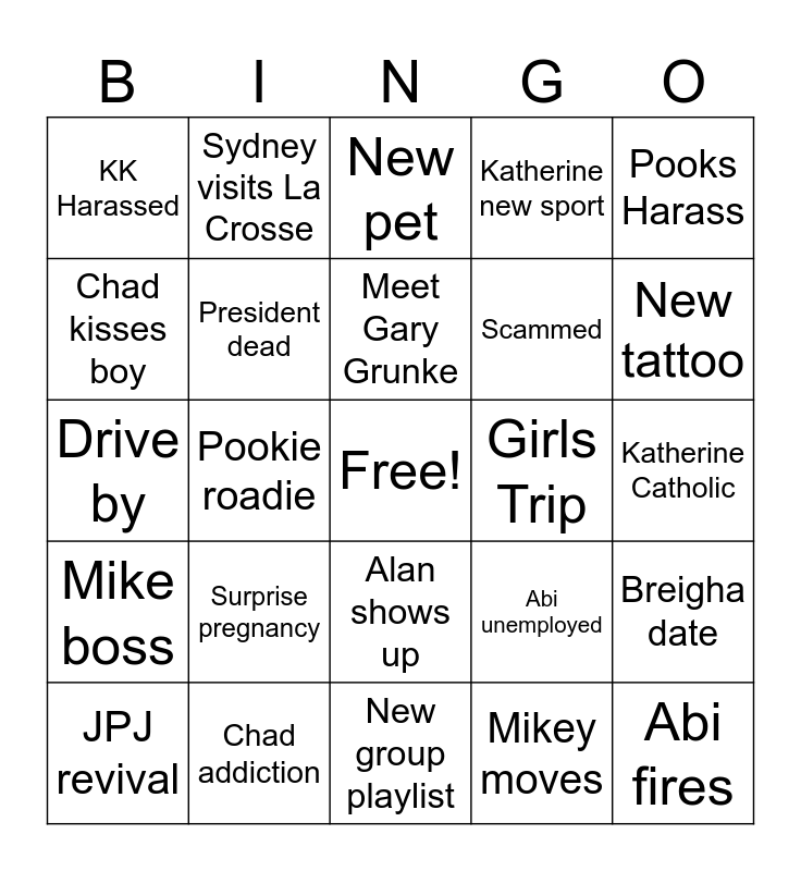 This bingo card has a free space and 24 words: Surprise pregnancy, Chad addiction, Meet Gary Grunke, JPJ revival, Pooks Harass, KK Harassed, Chad kisses boy, Sydney visits La Crosse, Girls Trip, Alan shows up, Scammed, Drive by, Abi unemployed, Breigha date, President dead, Mikey moves, Katherine Catholic, New pet, New tattoo, Pookie roadie, Abi fires, Mike boss, Katherine new sport and New group playlist.