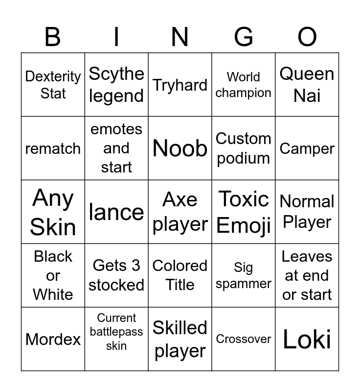 This bingo card has a free space and 24 words: Mordex, Gets 3 stocked, Noob, Crossover, Queen Nai, Dexterity Stat, Scythe legend, Tryhard, Toxic Emoji, Normal Player, Any Skin, emotes and start, Sig spammer, Leaves at end or start, rematch, Current battlepass skin, Skilled player, World champion, Camper, Black or White, lance, Colored Title, Custom podium and Loki.