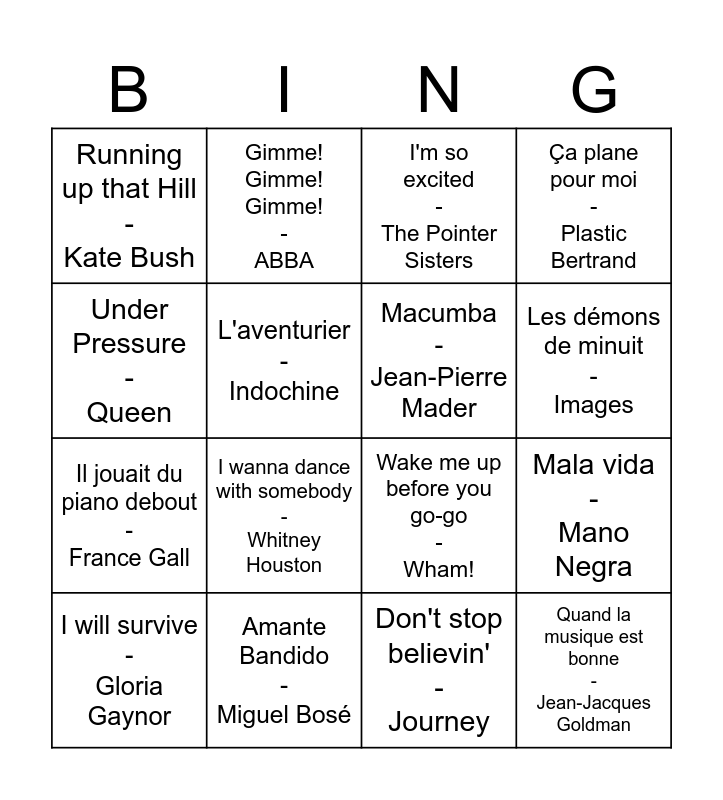 This bingo card has 24 words: Take on me - a-ha, Never gonna give you up - Rick Astley, Les démons de minuit - Images, Girls Just wanna have fun - Cindy Lauper, Under Pressure - Queen, Running up that Hill - Kate Bush, L'aventurier - Indochine, Gimme! Gimme! Gimme! - ABBA, Amante Bandido - Miguel Bosé, A quién le importa - Alaska y Dinamara, Il jouait du piano debout - France Gall, Wake me up before you go-go - Wham!, Sexual healing - Marvin Gaye, Lay all your love on me - ABBA, Macumba - Jean-Pierre Mader, Daddy Cool - Boney M., Don't stop believin' - Journey, I'm so excited - The Pointer Sisters, I wanna dance with somebody - Whitney Houston, Mala vida - Mano Negra, I will survive - Gloria Gaynor, Quand la musique est bonne - Jean-Jacques Goldman, Ça plane pour moi - Plastic Bertrand and Sarà perchè ti amo - Ricchi e Povveri.