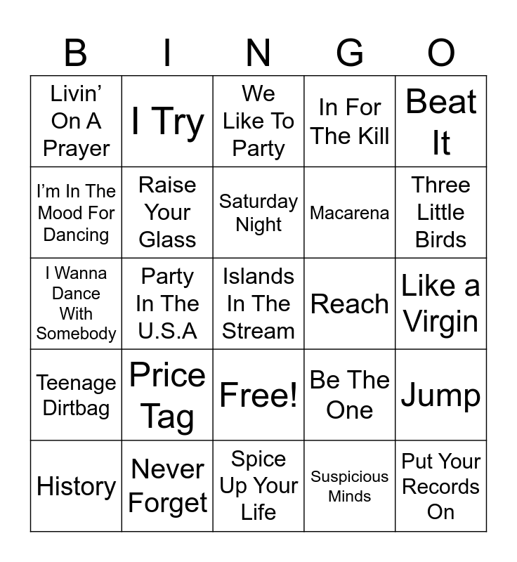 This bingo card has 26 words: Free!, Suspicious Minds, Saturday Night, Never Forget, Beat It, Livin’ On A Prayer, I’m In The Mood For Dancing, I Try, Like a Virgin, Be The One, Macarena, I Wanna Dance With Somebody, Jump, History, Party In The U.S.A, No Matter What, In For The Kill, Teenage Dirtbag, We Like To Party, Islands In The Stream, Three Little Birds, Spice Up Your Life, Reach, Price Tag, Raise Your Glass and Put Your Records On.