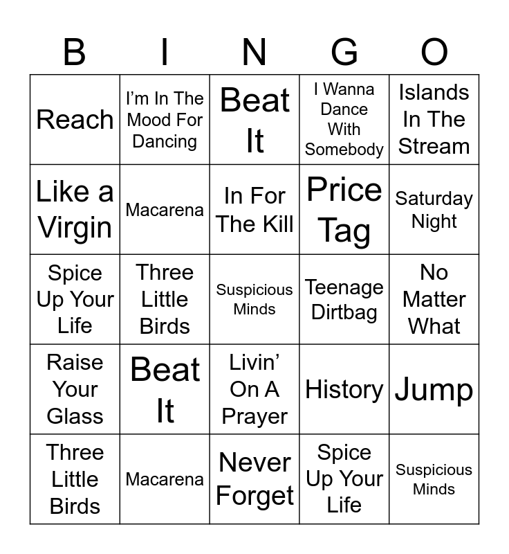This bingo card has 50 words: Free!, Suspicious Minds, Saturday Night, Never Forget, Beat It, Livin’ On A Prayer, I’m In The Mood For Dancing, I Try, Like a Virgin, Be The One, Macarena, I Wanna Dance With Somebody, Jump, History, Party In The U.S.A, No Matter What, In For The Kill, Teenage Dirtbag, We Like To Party, Islands In The Stream, Three Little Birds, Spice Up Your Life, Reach, Price Tag, Raise Your Glass, Suspicious Minds, Saturday Night, Never Forget, Beat It, Livin’ On A Prayer, I’m In The Mood For Dancing, I Try, Like a Virgin, Be The One, Macarena, I Wanna Dance With Somebody, Jump, History, Party In The U.S.A, No Matter What, In For The Kill, Teenage Dirtbag, We Like To Party, Islands In The Stream, Three Little Birds, Spice Up Your Life, Reach, Price Tag, Raise Your Glass and Put Your Records On.