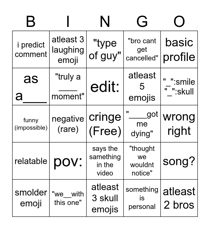This bingo card has a free space and 28 words: atleast 3 crying emoji, "we__with this one", edit:, something is personal, basic profile, i predict comment, "truly a ____ moment", atleast 3 skull emojis, "____got me dying", song?, funny (impossible), negative (rare), "thought we wouldnt notice", atleast 2 bros, as a___, "bro really said", says the samething in the video, "bro cant get cancelled", "_":smile "_":skull, smolder emoji, atleast 3 laughing emoji, atleast 2 comments saying the samething, atleast 5 emojis, wrong right, relatable, pov:, "type of guy" and caught in 4k.