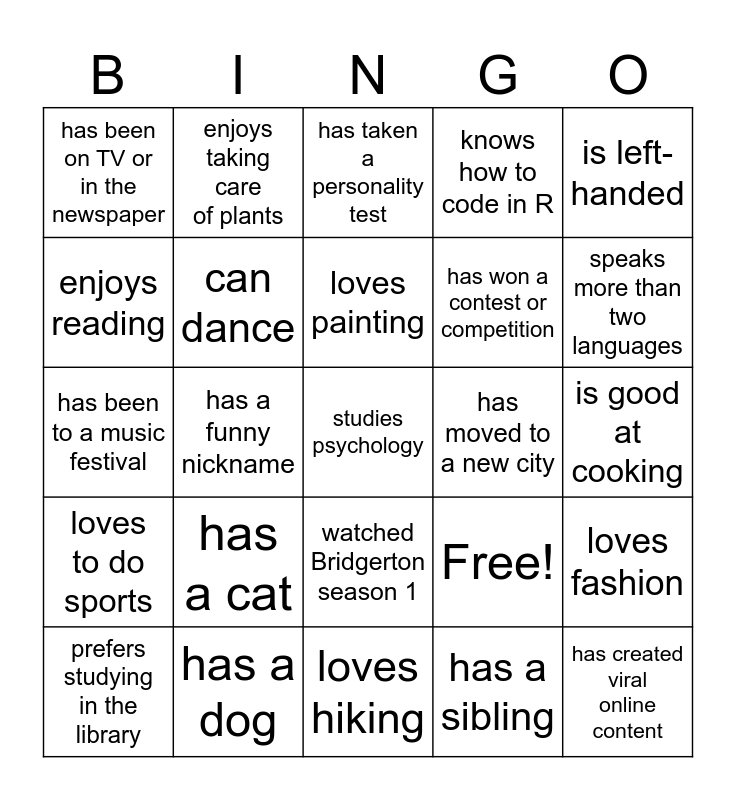 This bingo card has 25 words: has a cat, loves hiking, loves painting, prefers studying in the library, is left-handed, has been on TV or in the newspaper, enjoys reading, enjoys taking care of plants, has moved to a new city, watched Bridgerton season 1, has won a contest or competition, has been to a music festival, Free!, loves fashion, can dance, has created viral online content, is good at cooking, has taken a personality test, speaks more than two languages, has a funny nickname, studies psychology, has a dog, loves to do sports, knows how to code in R and has a sibling.