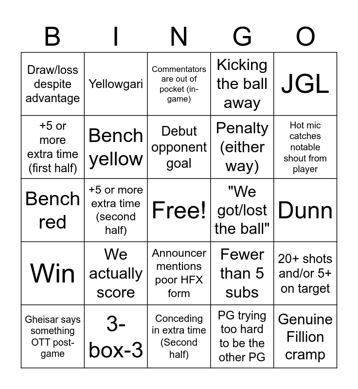 This bingo card has a free space and 63 words: Telfer, Rampersad, Volesky, 20+ shots and/or 5+ on target, Shocking defense, 10+ Fouls, Yellowgari, Incredibly cheap foul, Debut opponent goal, Other team first (non-goal), Announcer mentions poor HFX form, Announcer mentions poor opp form, Dunn, JGL, <30 U21 minutes, +5 or more extra time (first half), +5 or more extra time (second half), Draw/loss despite advantage, Deflection conceded, Penalty (either way), We actually score, Win, Kicking the ball away, Hot mic catches something funny, Normally decent player goofs really badly, Hoskins, Rudolf, MSB, Actual decent reffing, Notable Reffing Botch, Shot lands in Halifax Harbour/Quinpool Road, The captain isn't captaining, Donnybrook, Commentator's "curse" timing, Hot mic catches notable shout from player, Gheisar says something OTT post-game, Gheisar is delusional, PG trying too hard to be the other PG, Touchline antics, Bench yellow, Bench red, "We got/lost the ball", Desperate longshot, Fillion cramp, Genuine Fillion cramp, 3-box-3, First sub 60' or later, Fewer than 5 subs, Antics after FT, People leaving midgame, Perceived reffing botch, Conceding in extra time (Second half), Dissent yellow, Theme match, Conceding in extra time (First half), Commentators are out of pocket (in-game), Commentators are out of pocket (HT/Pre/Postgame), Time wasting yellow, Lunenburg shown (home games), WPIOOTBGW, 2+ consecutive corners, 3 or more HFX yellow cards and Red card (either way).