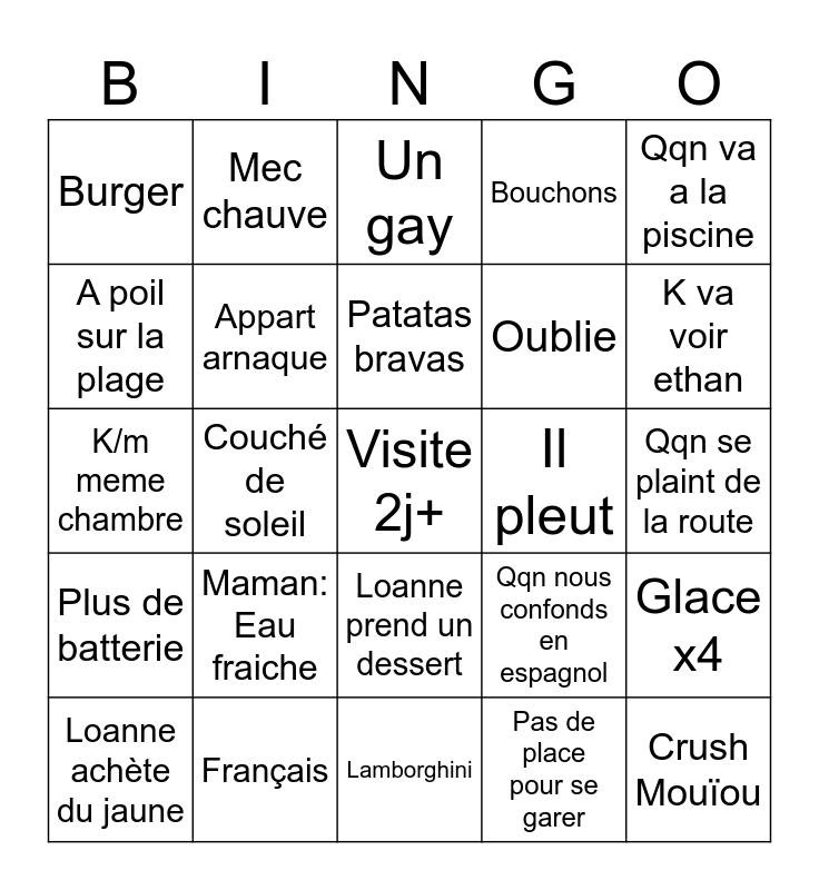 This bingo card has a free space and 24 words: Maman: Eau fraiche, Français, Patatas bravas, Loanne achète du jaune, Qqn va a la piscine, Burger, A poil sur la plage, Mec chauve, Il pleut, Loanne prend un dessert, Oublie, K/m meme chambre, Qqn nous confonds en espagnol, Glace x4, Appart arnaque, Pas de place pour se garer, Qqn se plaint de la route, Un gay, K va voir ethan, Couché de soleil, Crush Mouïou, Plus de batterie, Bouchons and Lamborghini.