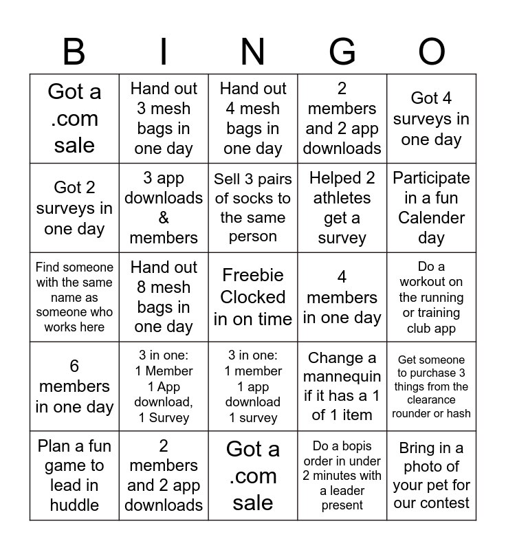 This bingo card has a free space and 24 words: 3 in one: 1 Member 1 App download, 1 Survey, 2 members and 2 app downloads, Sell 3 pairs of socks to the same person, Plan a fun game to lead in huddle, Got 4 surveys in one day, Got a .com sale, Got 2 surveys in one day, Hand out 3 mesh bags in one day, 4 members in one day, 3 in one: 1 member 1 app download 1 survey, Helped 2 athletes get a survey, Find someone with the same name as someone who works here, Change a mannequin if it has a 1 of 1 item, Get someone to purchase 3 things from the clearance rounder or hash, 3 app downloads & members, Do a bopis order in under 2 minutes with a leader present, Do a workout on the running or training club app, Hand out 4 mesh bags in one day, Participate in a fun Calender day, Hand out 8 mesh bags in one day, Bring in a photo of your pet for our contest, 6 members in one day, 2 members and 2 app downloads and Got a .com sale.