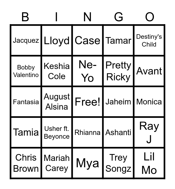 This bingo card has a free space and 24 words: Chris Brown, Usher ft. Beyonce, Ne-Yo, Trey Songz, Destiny's Child, Jacquez, Lloyd, Case, Jaheim, Monica, Fantasia, Keshia Cole, Ashanti, Ray J, Bobby Valentino, Mariah Carey, Mya, Tamar, Avant, Tamia, August Alsina, Rhianna, Pretty Ricky and Lil Mo.