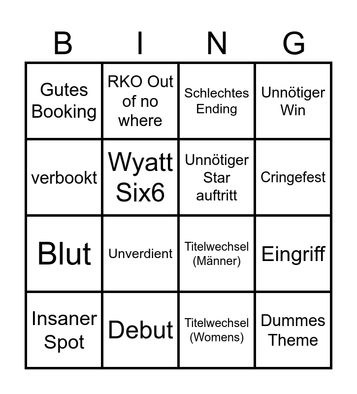 This bingo card has 16 words: Debut, Eingriff, Schlechtes Ending, Gutes Booking, Blut, RKO Out of no where, Titelwechsel (Männer), Titelwechsel (Womens), verbookt, Wyatt Six6, Insaner Spot, Unnötiger Win, Unverdient, Cringefest, Unnötiger Star auftritt and Dummes Theme.