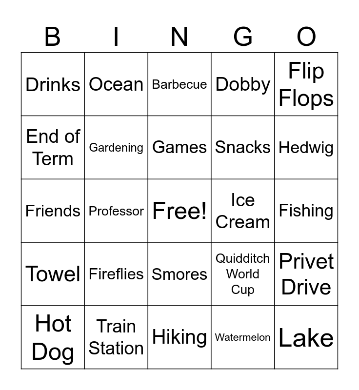 This bingo card has a free space and 80 words: Air Conditioning, Amusement Park, Barbecue, Baseball, Bathing Suit, Beach, Bonfire, Burrow, Camping, Cookout, Concert, Cupboard, Dobby, Drinks, Dursleys, End of Term, Festivals, Fireflies, Fireworks, Fishing, Float, Flip Flops, Friends, Games, Gardening, Goggles, Grass, Hamburger, Harry, Heat, Hedwig, Hermione, Hiking, Holiday, Hot Dog, Ice Cream, Iced Tea, Jet Ski, July, Lake, Lemonade, Lifeguard, Memories, Muggles, Nap, Ocean, Palm Tree, Picnic, Pool, Popsicle, Privet Drive, Professor, Quidditch World Cup, Reading, Relax, Ron, Sailing, Sand, Seashell, Smores, Snacks, Snake Away Camp, Sprinkler, Swimming, Summer Break, Summer Camp, Sun, Sunglasses, Sunscreen, Tan, Towel, Train Station, Travel, Umbrella, Vacation, Water Park, Watermelon, Waves, Weasleys and Zoo.