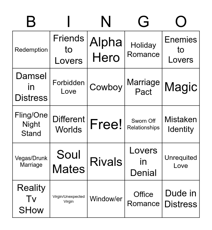 This bingo card has a free space and 75 words: Age Gap, All Grown Up, Alpha Hero, Antihero, Arranged Marriage, Au-Pair/Nanny, Best Friend's Ex, Best Friend's Lover, Best Friend's Sibling, Bets, Billionaire, Blackmail, Cowboy, Damsel in Distress, Dark Secret, Different Worlds, Disguise, Dude in Distress, Emotional Scars, Enemies to Lovers, Fake Relationship, Fling/One Night Stand, Forbidden Love, Friends to Lovers, Holiday Romance, Honorable Marriage, Injury, Innocent Cohabitation, Kidnapped, Last to Know, Long Distance, Love / Hate, Love at First Sight/Insta Love, Lovers in Denial, Magic, Marriage Pact, Matchmaker, Mistaken Declaration, Mistaken Identity, Office Romance, Old Enemies, One That Got Away, Opposites Attract, Physically Different, Rags to Riches, Rake / Playboy in Love, Reality Tv SHow, Redemption, Rejected, Revenge, Reverse Harem, Rivals, Road Trip, Royals, Runaway Bride, Runion/Return Home, Second Chance, Secret Baby, Secret Identity, Small Town, Soul Mates, Star-Crossed Lovers, Stranded, Sudden | Unexpected Baby, Sunny vs Grump, Sworn Off Relationships, Time Travel, Trapped in an Elevator, Ugly Duckling, Unrequited Love, Vegas/Drunk Marriage, Virgin/Unexpected Virgin, Wallflower, Window/er and Working with Ex.