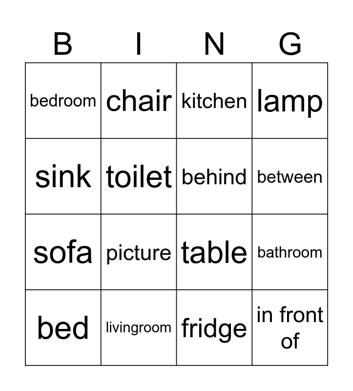 This bingo card has 16 words: livingroom, bathroom, kitchen, bedroom, sofa, chair, table, fridge, sink, toilet, bed, lamp, picture, between, behind and in front of.