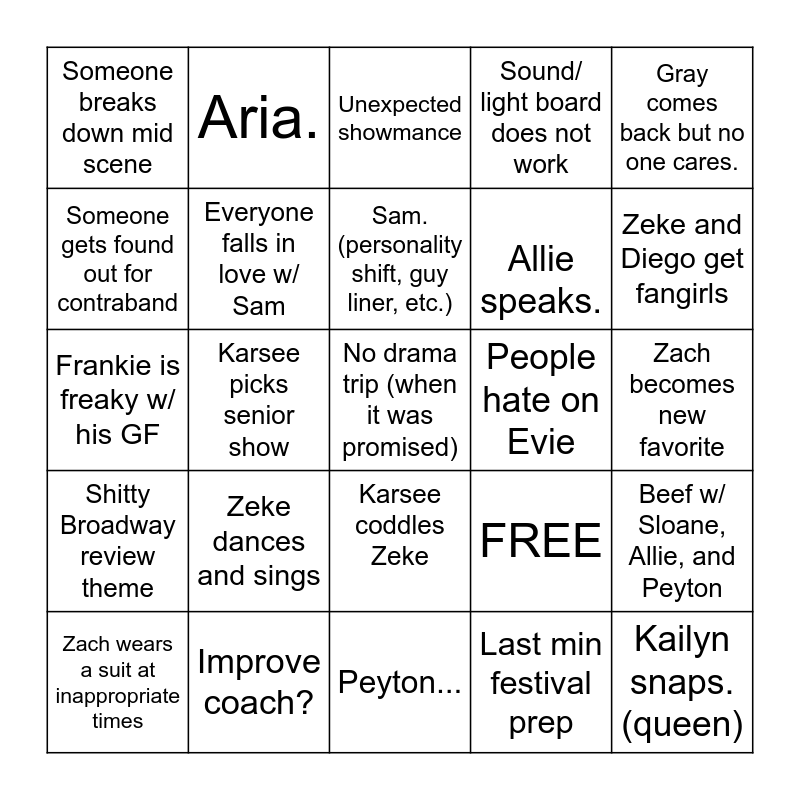 This bingo card has 25 words: Zeke dances and sings, Peyton..., Sam. (personality shift, guy liner, etc.), Zach wears a suit at inappropriate times, Gray comes back but no one cares., Someone breaks down mid scene, Someone gets found out for contraband, Aria., People hate on Evie, Karsee coddles Zeke, Allie speaks., Frankie is freaky w/ his GF, FREE, Beef w/ Sloane, Allie, and Peyton, Everyone falls in love w/ Sam, Kailyn snaps. (queen), Zach becomes new favorite, Unexpected showmance, Zeke and Diego get fangirls, Karsee picks senior show, No drama trip (when it was promised), Improve coach?, Shitty Broadway review theme, Sound/ light board does not work and Last min festival prep.