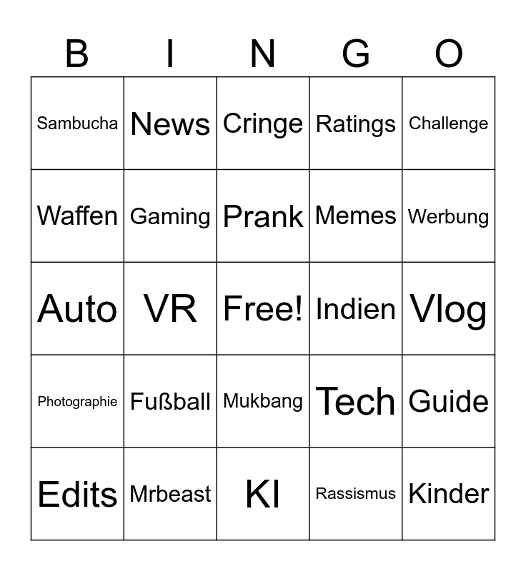This bingo card has a free space and 24 words: Fußball, Mrbeast, Prank, Edits, Challenge, Sambucha, Waffen, News, Indien, Mukbang, Memes, Auto, Tech, Guide, Gaming, Rassismus, Vlog, Cringe, Werbung, VR, Kinder, Photographie, Ratings and KI.