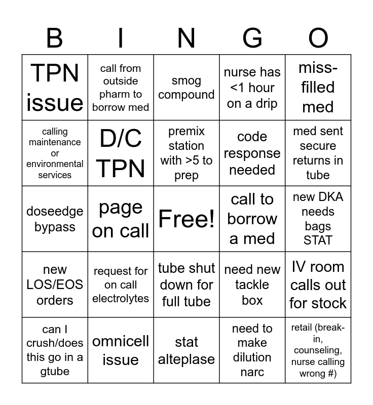 This bingo card has a free space and 57 words: compatibility question, can I crush/does this go in a gtube, call out/or >10 min late, TPN issue, stat alteplase, temperature/pressure alarm, D/C TPN, IV hoarding stats, code response needed, picu missing med, nurse has <1 hour on a drip, move meds between omnicell, med request for order put in <10 min ago, need med from central or nurse requesting item that comes from central, fast mover out of stock, tube station down, miss-filled med, page on call, request for med to be tubed on do not tube list, retail (break-in, counseling, nurse calling wrong #), call to borrow a med, med message requesting drug in omnicell, need new tackle box, smog compound, new chemo/chemo issue, premix station with >5 to prep, page or call NNP, rec from a consult service, med sent secure returns in tube, omnicell discrepancy, med not scanning (doseedge or nurse call), trauma B/stab code/OB c-section, expired med (not compound), call from OR, new DKA needs bags STAT, calling maintenance or environmental services, pharm-is ticket, doseedge bypass, brand new TPN, new LOS/EOS orders, call from outside pharm to borrow med, tube shut down for full tube, request for vfc vaccine, recon antibiotic, ID home med, status board clear, request for on call electrolytes, omnicell issue, med message requesting med scanned into med bin, phone call from MD needing dose recommendation, critical dose warning override, need to make dilution narc, nurse calls and asks for med to be approved, extravasation question, Door bell to pharmacy, IV room calls out for stock and DE rework.