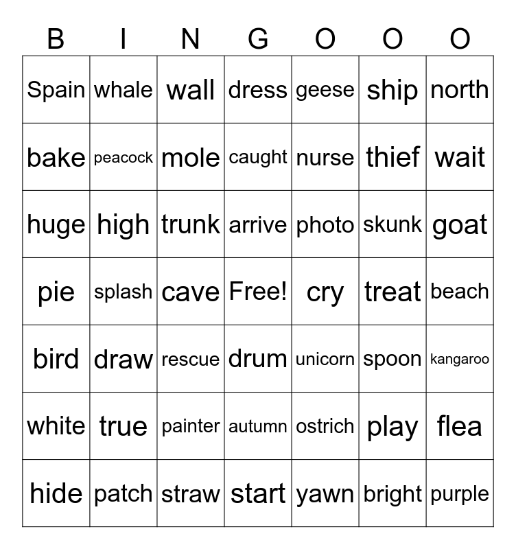 This bingo card has a free space and 48 words: ostrich, thief, start, splash, trunk, beach, whale, patch, ship, drum, north, dress, skunk, photo, white, treat, bake, wait, play, geese, nurse, cave, Spain, peacock, flea, mole, goat, hide, arrive, high, bright, cry, kangaroo, true, pie, unicorn, spoon, huge, rescue, painter, bird, purple, wall, straw, caught, autumn, draw and yawn.