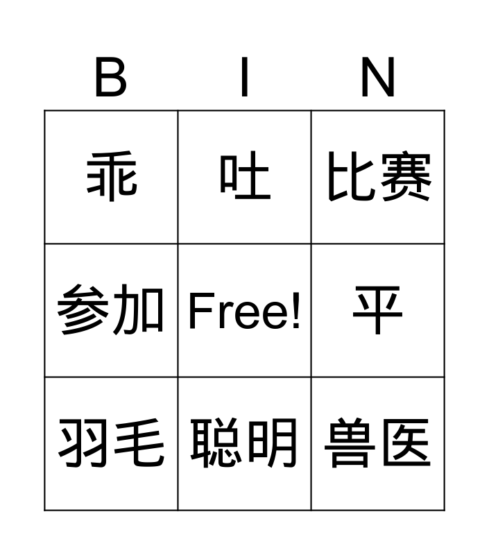 This bingo card has a free space and 8 words: 平, 比赛, 吐, 羽毛, 乖, 兽医, 参加 and 聪明.