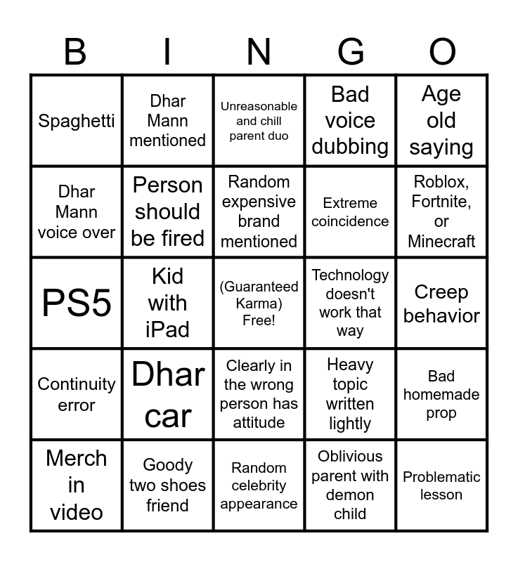 This bingo card has a free space and 36 words: Bullied for something small, Dork/Nerd wears glasses, Unreasonable punishment, Person should be fired, Heavy topic written lightly, Continuity error, Random expensive brand mentioned, Parking lot confrontation, Age old saying, Cartoon super villain, Kid with iPad, Bad voice dubbing, Cops don't act that way, Technology doesn't work that way, Roblox, Fortnite, or Minecraft, Spaghetti, Couple should be divorced, Dhar car, Problematic lesson, Unreasonable and chill parent duo, Creep behavior, Bad homemade prop, Goody two shoes friend, Merch in video, Random celebrity appearance, Dhar Mann mentioned, PS5, Racist/Feels racist, Extreme coincidence, Dhar Mann voice over, Quick unjustified anger, Timeskip, Oblivious parent with demon child, Clearly in the wrong person has attitude, Narc and Random thoughts out loud.