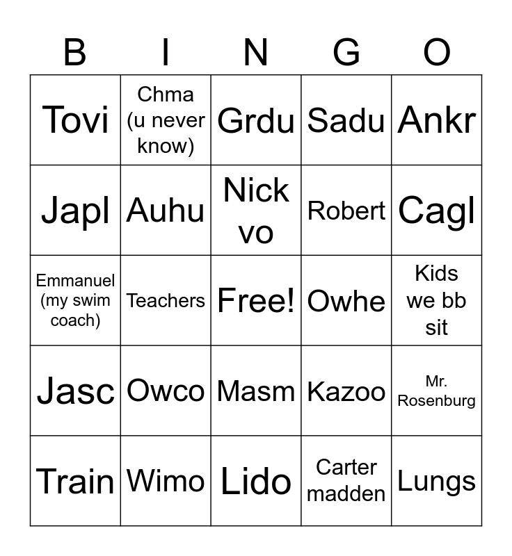 This bingo card has a free space and 26 words: Masm, Carter madden, Nick vo, Wimo, Ankr, Tovi, Japl, Chma (u never know), Kids we bb sit, Kazoo, Robert, Emmanuel (my swim coach), Mr. Rosenburg, Train, Teachers, Owha, Sadu, Jasc, Grdu, Lungs, Cagl, Lido, Owhe, Owco, Auhu and A surprise!.