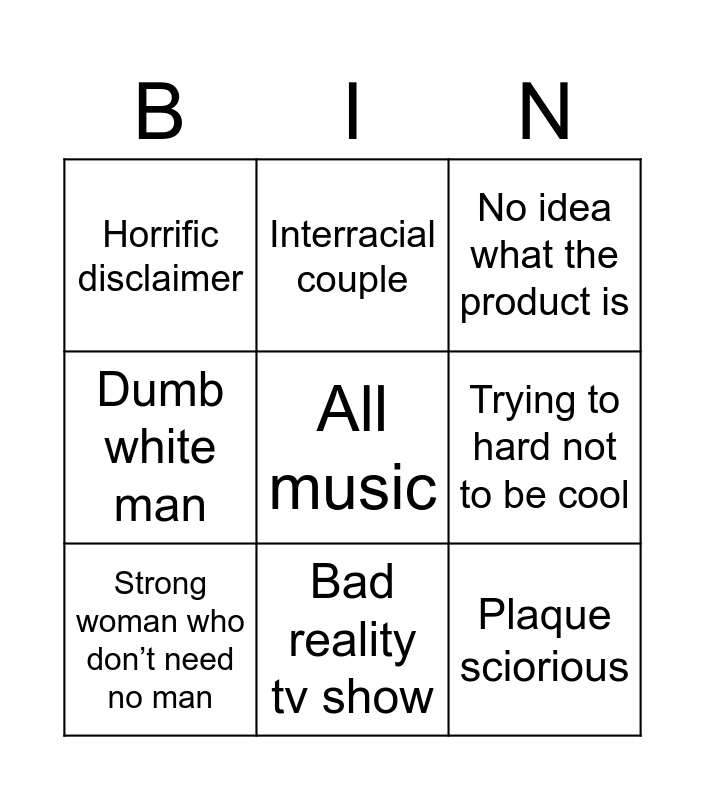 This bingo card has 9 words: Strong woman who don’t need no man, No idea what the product is, Interracial couple, Dumb white man, Horrific disclaimer, Trying to hard not to be cool, All music, Plaque sciorious and Bad reality tv show.